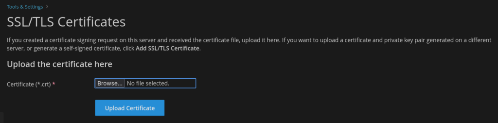 Then upload the pem file to Plesk under Tools & Settings > SSL/TLS Certificates: