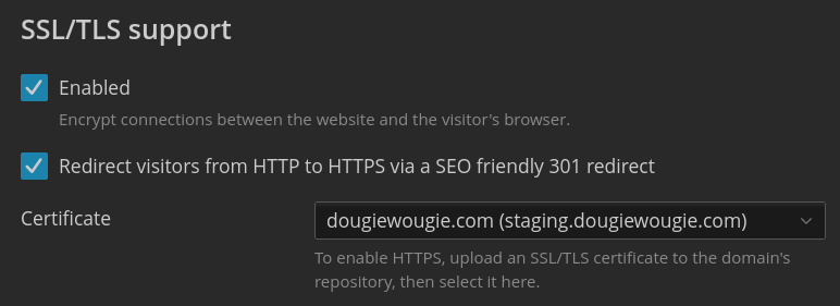 Finally, remember to attach the certificate to each site (Websites & Domains > Your Domain Name > Hosting & DNS > Certificate).